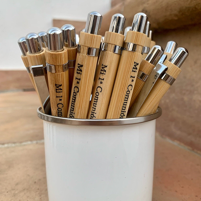Añade un toque de distinción a tu escritura con este elegante bolígrafo de mecanismo pulsador, diseñado con un cuerpo de madera de bambú natural que combina sostenibilidad y estilo. Sus accesorios metálicos en un acabado plateado brillante aportan un toque sofisticado, ideal para cualquier ocasión.