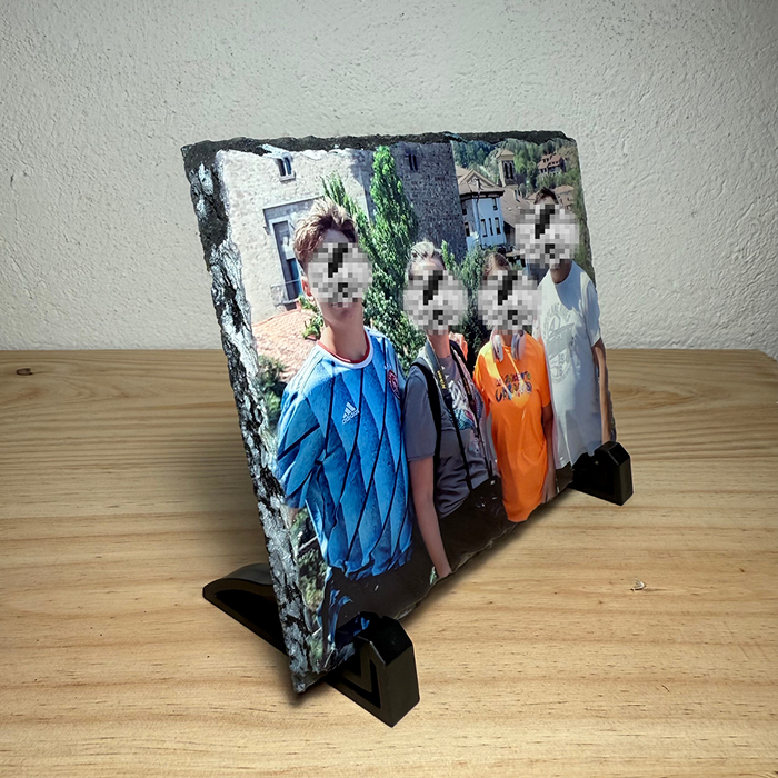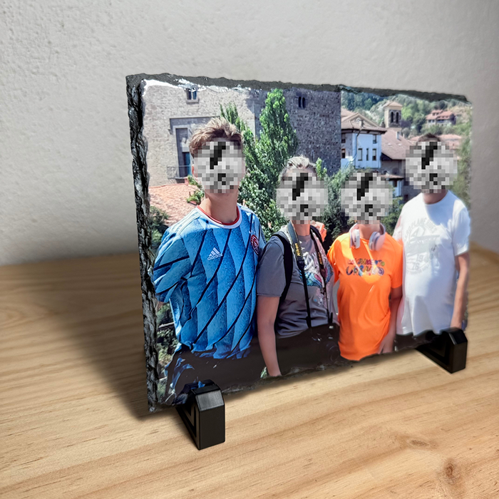 Descubre este original y elegante portafoto de pizarra, un detalle único y personalizable. Ideal para decorar cualquier espacio con imágenes o mensajes originales, este cuadro de piedra de pizarra es perfecto para colocar sobre una mesa o estante, aportando un toque sofisticado y exclusivo.