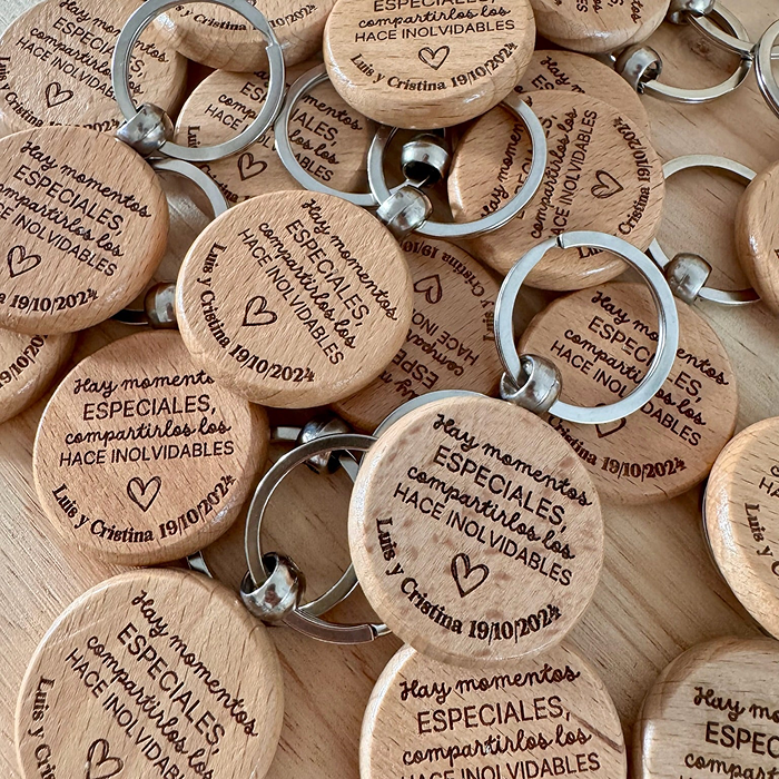 Regala un detalle especial lleno de significado con este elegante llavero redondo de madera natural de haya, diseñado para ser único y personal. Su diseño minimalista y natural lo convierte en el accesorio perfecto para llevar siempre consigo un recuerdo especial.